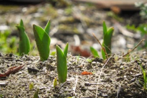 桜の木々の枝の先が、うっすらと色づいているように見えます。つぼみが膨らんできているんですね。植物の方が、よほど気候に敏感のようです。弊社の玄関横にあるプランターの中には、寒さに耐え、様子見に芽を出したチューリップの姿が!!